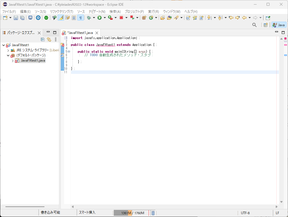 このファイルの2行目の左に赤い×マークが付いています。これはエラー表示です。ここではApplicationクラスを使うのに必要なimportが為されていないために表示されています。このアイコンをマウスで左クリックすると、メニューの一番上に「Applicationをインポートします(javafx.application)」と表示されるので、この行をダブルクリックすると、以下のようにjavafx.application.Applicationがimportされて赤い×マークが消えます(ここで、「Applicationをインポートします(javafx.application)と表示されない場合には、Liberica JDKのJavaFXを用いるバージョンがインストールされていないので、該当のフォルダを削除して、ダウンロード、インストールをやり直してください」)。